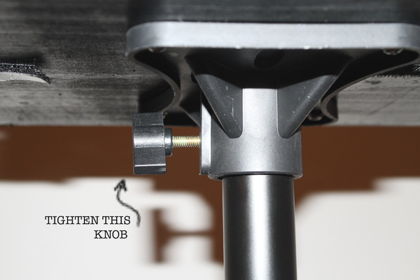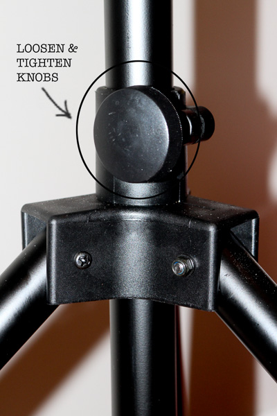 Loosen the knobs to allow the legs to open up. Open up all the way to make a sturdy base. Tighten knob so it doesn’t easily fold back in (not too tight, you don’t want to strip the screw!).