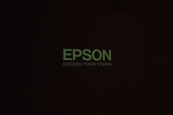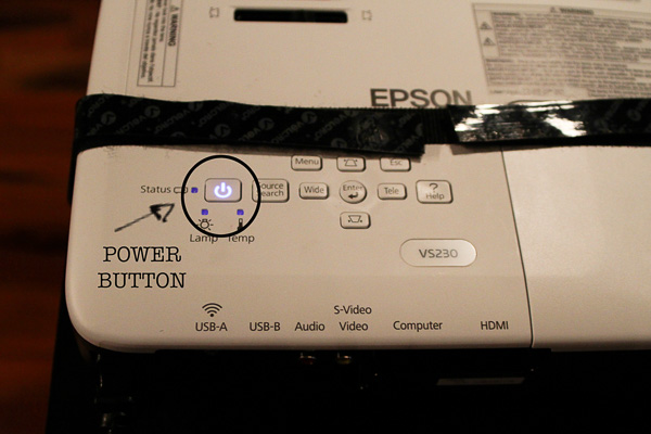 Projector will beep once, then you’ll hear the fans turn on. It takes a few seconds for the projector to warm up. You should see the Epson screen appear.