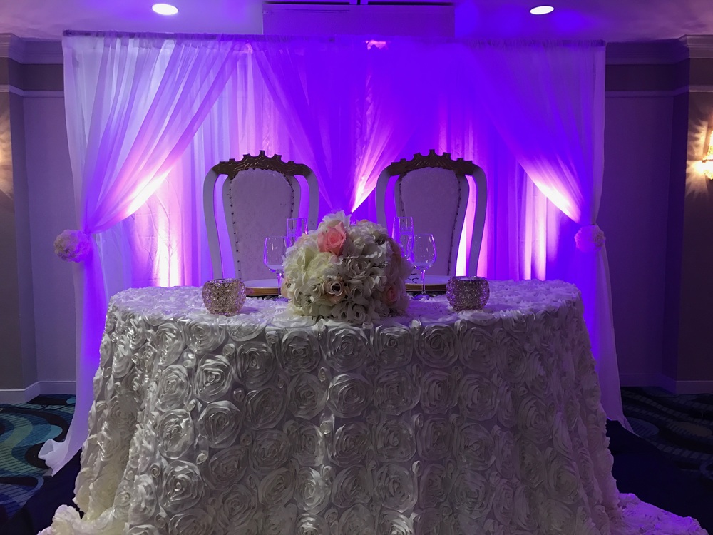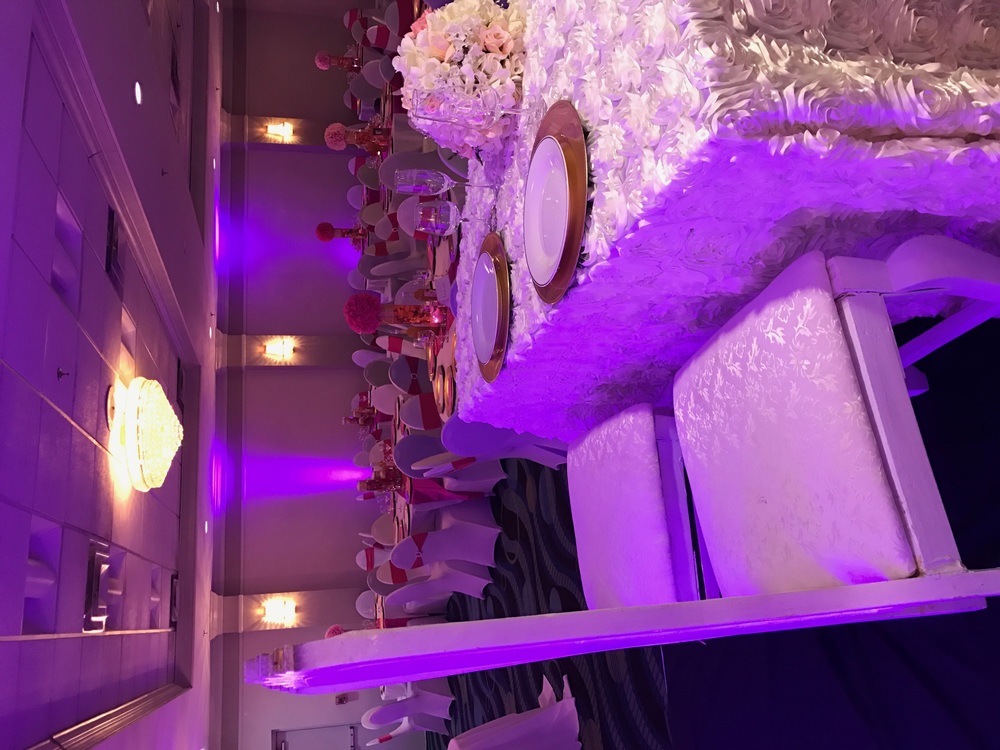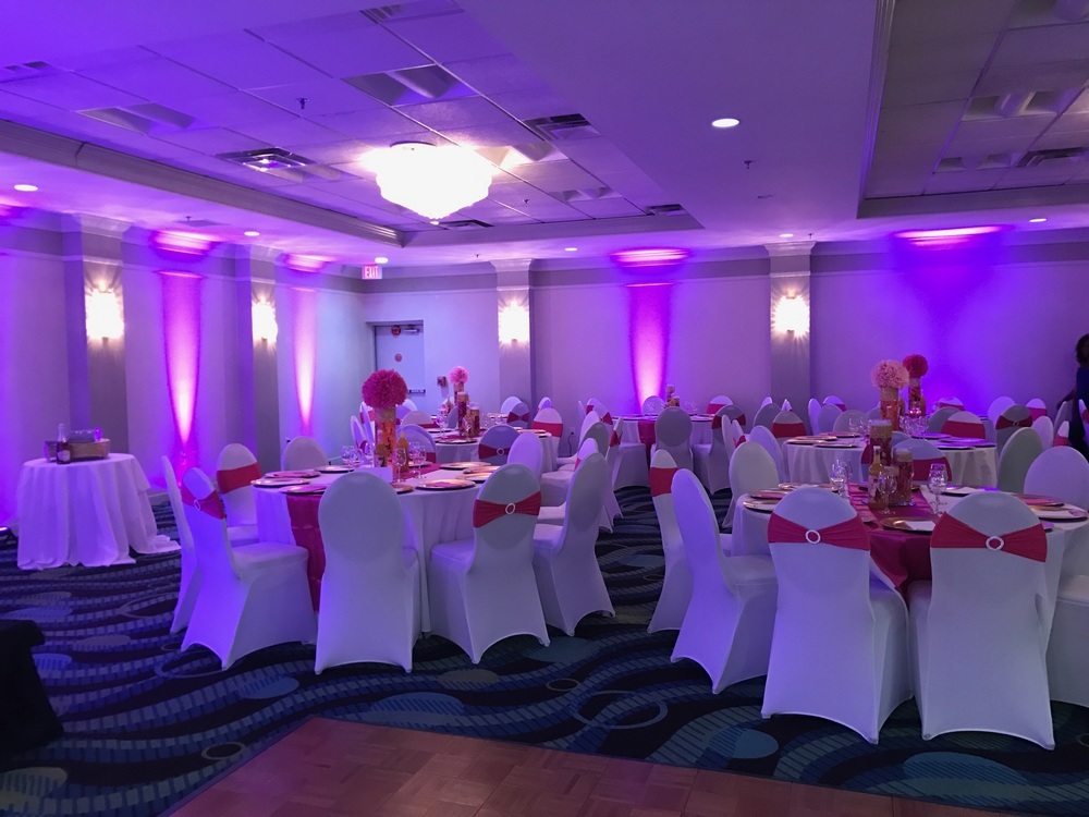 You can use uplighting to set the mood at any kind of party. Here are some photos from a 30th Anniversary party. 18 Par 56 up lights were rented to create the effect. The event was at the Holiday Inn in Springfield, VA. We ship our lighting rentals anywhere within the continental USA. Rentals are guaranteed to arrive at least 2 days before your event so you'll have time to receive and set them up. Setup is easy, just place around the room and set your color using the built-in digital display.