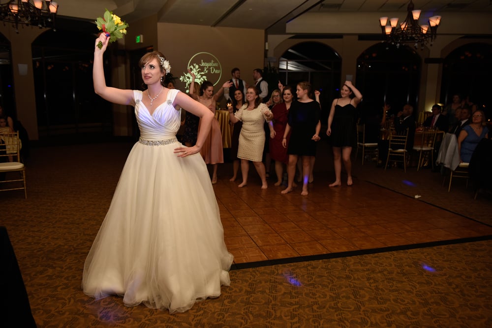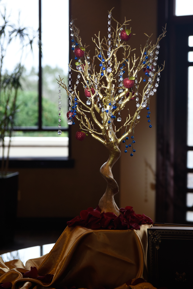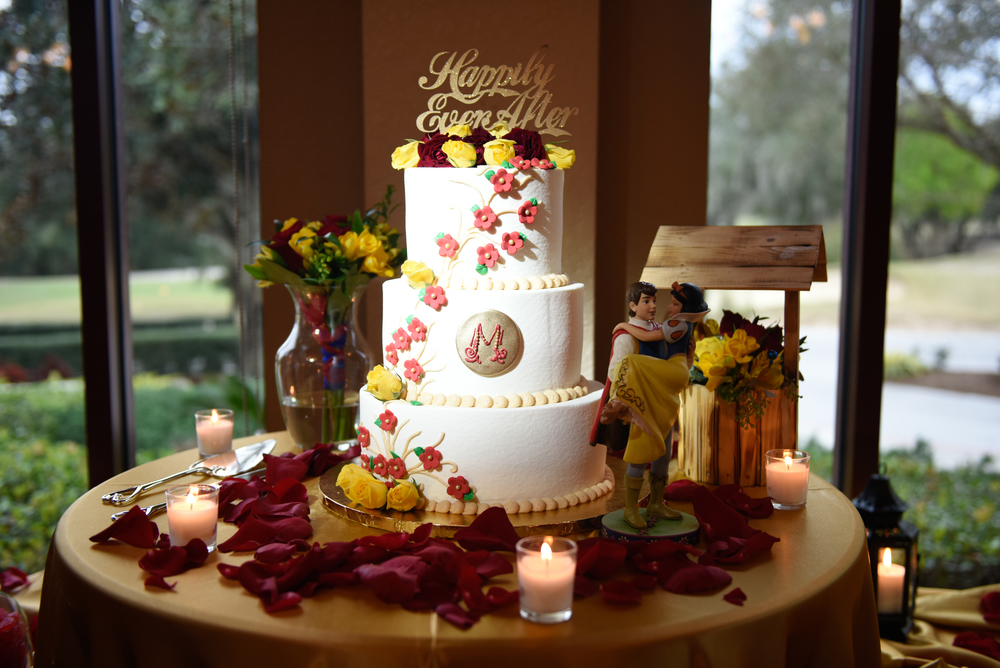 Haleigh from Oh Snap! Images sent in these photos from a wedding she helped with. She rented a projector for the monogram behind the bride and groom's table and a few pin spots for the cake, a statue, and a special tree at the entrance. The wedding was held at Mystic Dunes in Celebration, Florida.