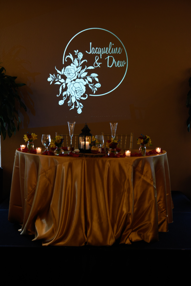 The monogram effect in the photo was achieved with a projector. We have some pre-designed monograms you can use, check them out here: monogram templates. Pictured in these photos is design #6.