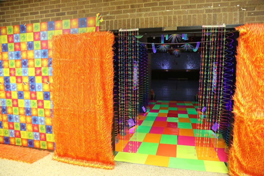An elementary school in Germantown, TN had a disco dance and used 4 black lights to decorate the entrance. Notice the 4 lights simply placed on the floor using the provided floor stands.