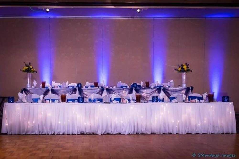 The Par 56 remains the most popular led uplight we rent. They are the most affordable choice that provides the most bang for your buck! These 2 photos below sent in from a rental client shows 5 lined up behind the head table at a wedding. Uplighting is a great way to accent a wall!