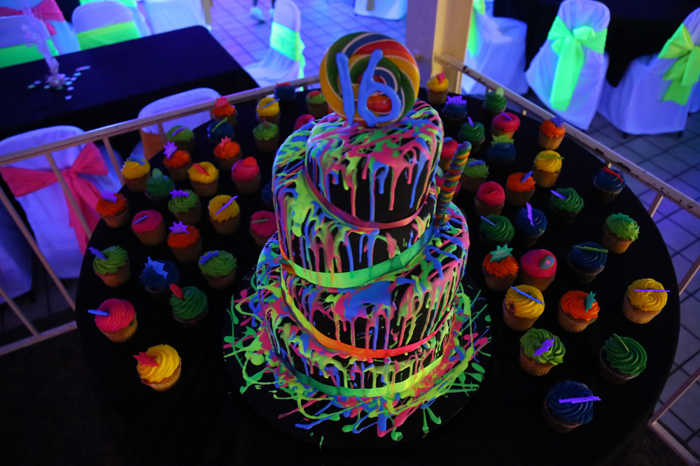 12 rental black lights provided the glow in the dark effect at a sweet 16 party in Berkley, MI at the American Legion hall. Our client originally wanted to hang the lights, but the hall would not allow it. The black lights come with a built-in floor stand though, so he was able to angle the lights off the floor providing the desired effect. Easy set-up! You can make your Sweet 16 party glow using our affordable Black Light Rentals, starting at only $17 per light.