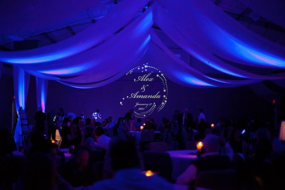 Rent a projector here: Projector Rental. We can display any JPEG or PNG file you send in with your initials, names, monogram or logo. If you prefer, you can choose from one of our templates.